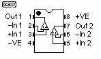 Standard Dual opamp pinouts are shown on the left. These are an industry standard, and are the most readily available and easiest to work with. Make sure that a bypass cap is connected between supplies, as close as possible to the supply pins. Alternatively, use a bypass cap from each supply pin to ground. Bypass capacitors should be 100nF monolithic ceramic types for best performance.